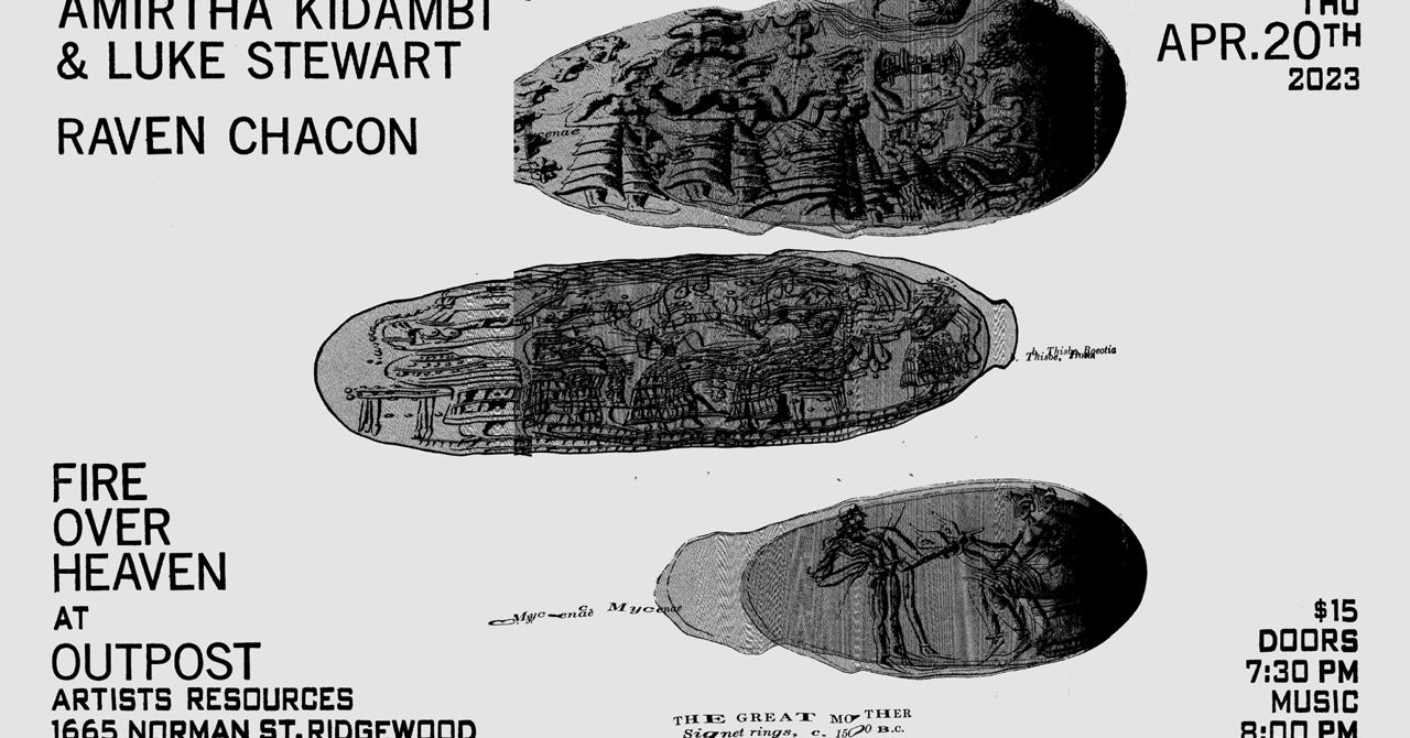 Fire Over Heaven continues on Thursday, April 20th with sets by Raven Chacon and Amirtha Kidambi & Luke Stewart. Chacon made big news last year for being the first indigenous composer to win the Pulitzer prize, for his Voiceless Mass, but it's probably equally true that he is the first noise musician to win the award? Until recently based in Albuquerque, NM, where he was central to the south west DIY/noise scene, Chacon has always explored a lo-fi aesthetic of cracked and extreme sonics in parallel to the charged chamber music works that have recently brought him more widespread attention. It's fairly safe to say we'll be getting the basement noiser Chacon for this special solo set ... Amirtha Kidambi and Luke Stewart have both played at Fire Over Heaven before in other formations but it is a real joy to have them return as a duo. Kidambi is one of the deepest improvising vocalists working today, capable of transmuting elements of experimental, early music and South Indian vocal traditions through the cosmic sensibilities of John and Alice Coltrane. Luke Stewart is one of the busiest bassists in town (or any town), and has been steadily reviving and extending the free jazz tradition by pushing its boundaries into conversation with noise, rock and minimalism via electronics, feedback and a powerful command of both the "upright" and "guitar" forms of his chosen instrument, the bass. If the duo's first cassette, Zenith-Nadir, is any clue, we're likely to find them exploring dimensions acoustic-electric, noise-melodious, past and future now in the beautiful Outpost space.