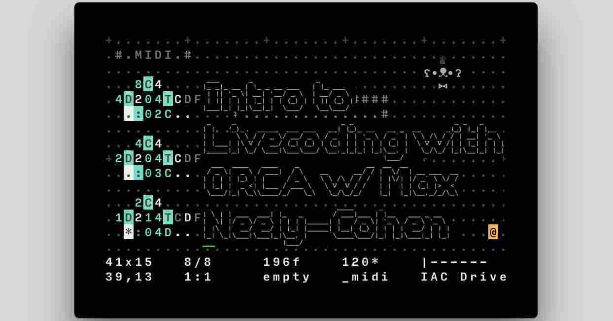 Join Maxwell Neely-Cohen for a tutorial on using esoteric programming language ORCA to sequence and generate music. Almost reminiscent of John Conway's Game of Life or Dwarf Fortress, ORCA allows a unique approach to music making and programming, building rhythms and melodies out of shifting alphanumeric characters.