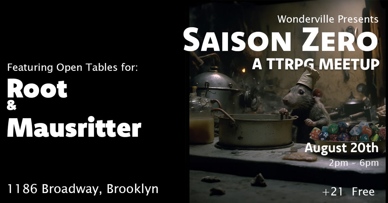 Hello! Lovely people, looking to jump into the wide world of TTRPGs like D&D, but maybe a little less crunchy? Looking to meet fellow nerds who are into role play (of the tabletop variety)? Come on down to Saison Zero,this month we’re getting little! We’ll be holding open tables for Root and Mausritter!