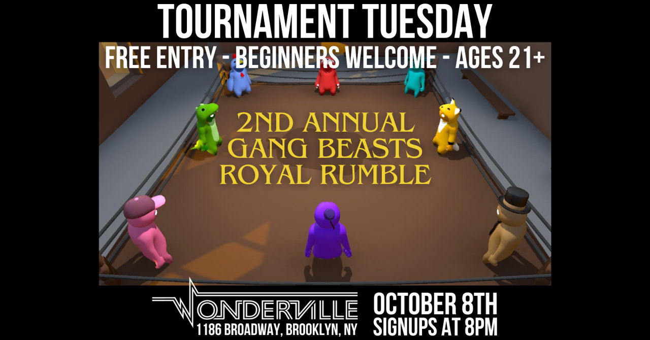 GANG BEASTS returns to the Tournament Tuesday stage in this hectic, endless 1vs1vs1vs1vs1vs1vs1vs1 last-person-standing event! Hosts Ivy & Miel will turn up the chaos with jeers and prizes! Join for free, fight your friends, and claim your title!