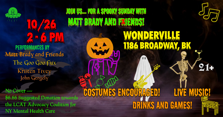 Brooklyn! We’re coming into the spooky fall season, and everything around us already feels kind of scary, right? So your friendly neighborhood community music therapists are proud to be back to host an afternoon event for your self-care pleasure! Trick or treat yourself and join us for an afternoon of live music, drinks, games, and community! Costumes are highly encouraged!