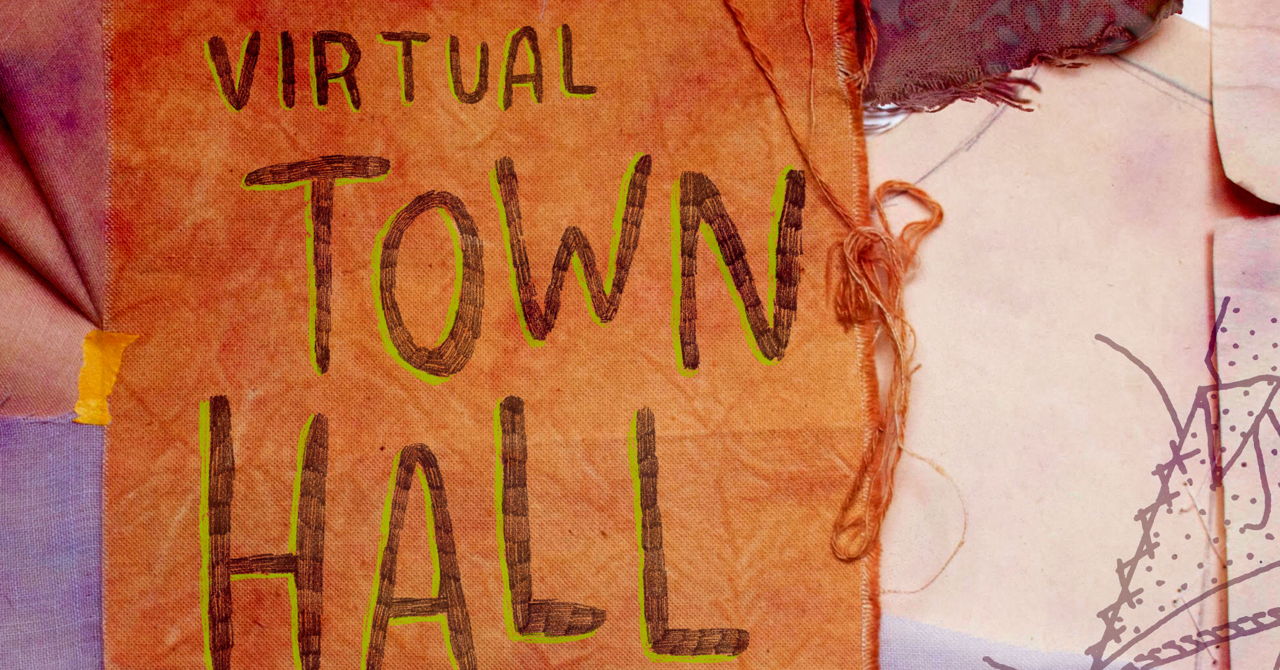 Image Description: Bubbly, hand-written pencil text with an avocado green shadow reads: "Virtual Town Hall." Below, smaller text reads: "With Nobody's Fashion Week. Wednesday, July 8. 5-7pm EDT." In the background there are scattered layers of paper and fabric in shades of neutrals and light blue. Flyer created by Juliet Johnson, Lexy Ho-Tai, and Johanna Schwab.