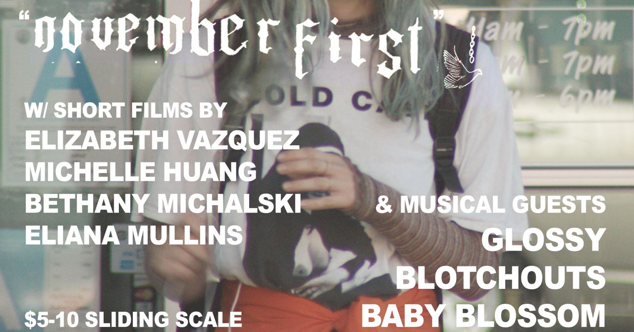 Coaxial Arts Foundation is proud to present a screening of local filmmaker and musician Eliana Mullins' short film November First. The film will be accompanied by other short films and followed by live musical performances from Glossy, Blotchouts, and Baby Blossom.