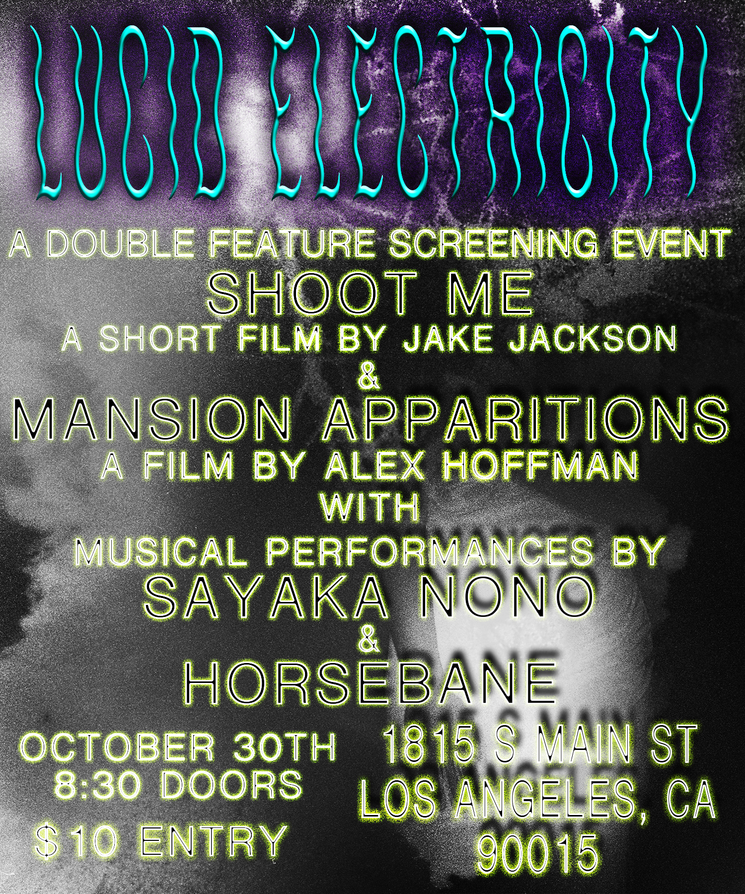 Join us for LUCID ELECTRICITY, a spooky double feature short film event showing SHOOT ME a short film by Jake Jackson and MANSION APPARITIONS by Alex Hoffman with live music from SAYAKA NONO and HORSEBANE. Costumes encouraged but not required.