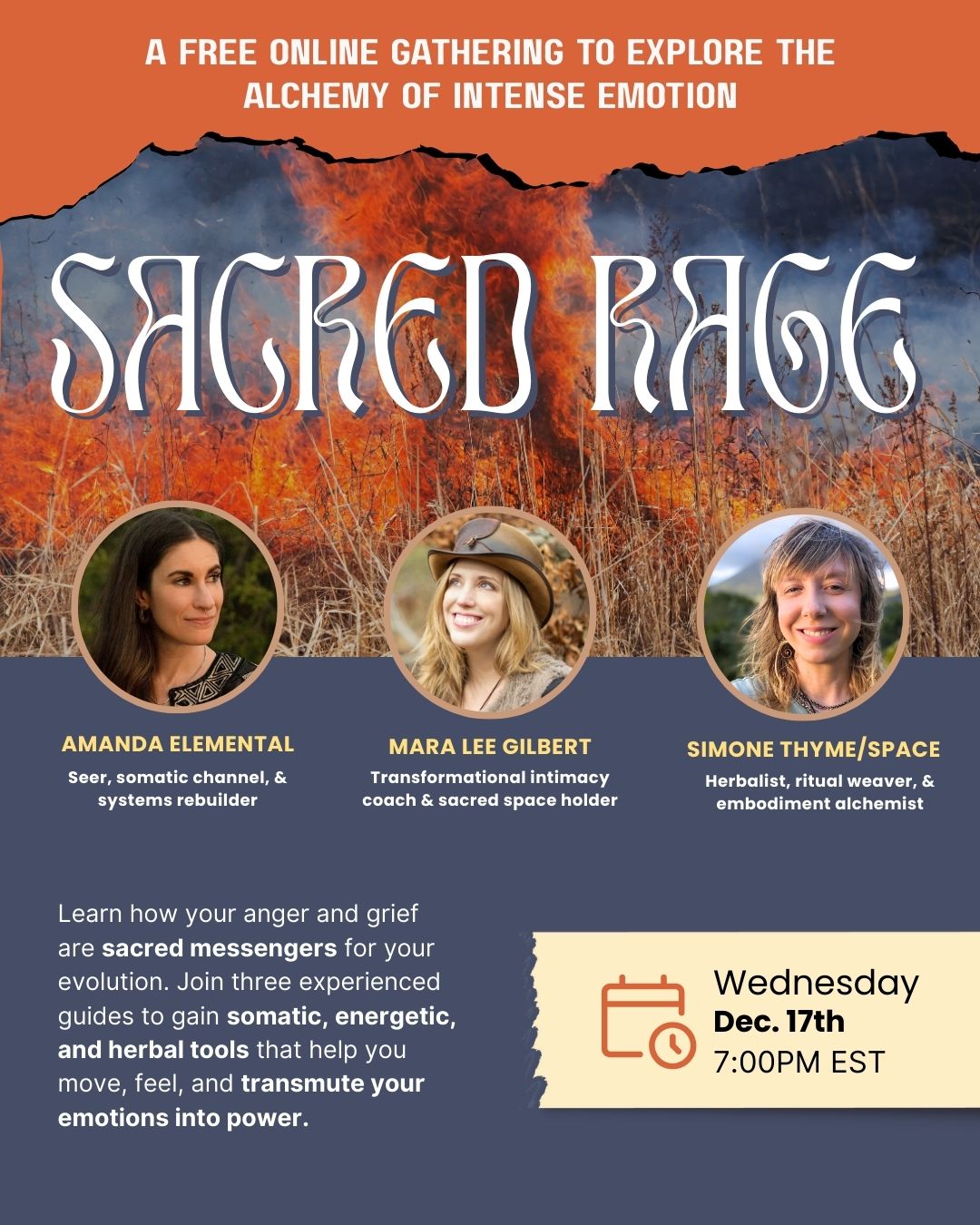In this free online gathering, the facilitators of Temple of the Burning Heart invite you into a deeply held space to explore how rage moves through the body, spirit, and lineage — and how it can be transmuted into clarity, action, and inner strength. Can’t make it live? RSVP anyway — you’ll receive the replay.