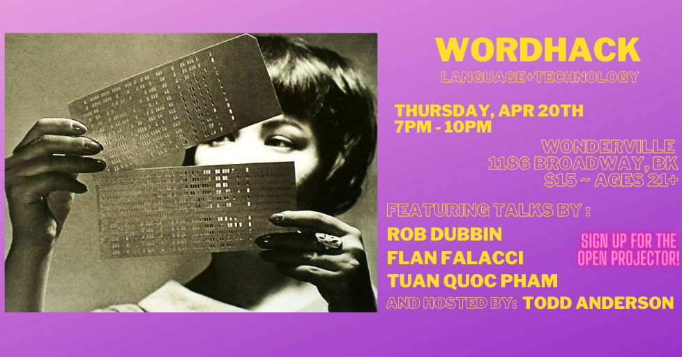 WordHack is a monthly evening of performances and talks exploring the intersection of language and technology. Code poetry, digital literature, e-lit, language games, coders interested in the creative side, writers interested in new forms writing can take, all are welcome here.