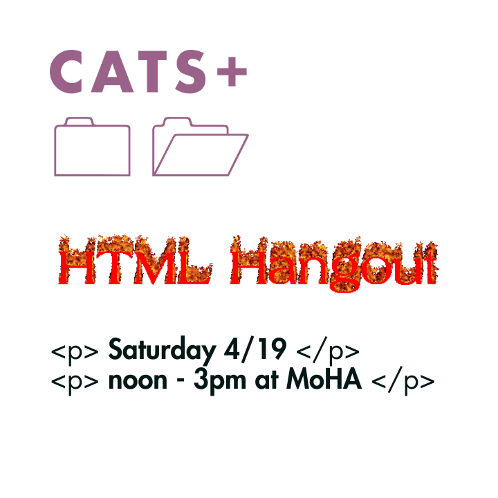 Let's code! MoHA's Collaborative Art + Technology Situation (CATS+) is hosting a chill HTML/CSS hangout. Join us for a social coworking time to learn from each other, talk to real humans about html struggles and achievements, and/or just get in some accountability time to update your dang website.