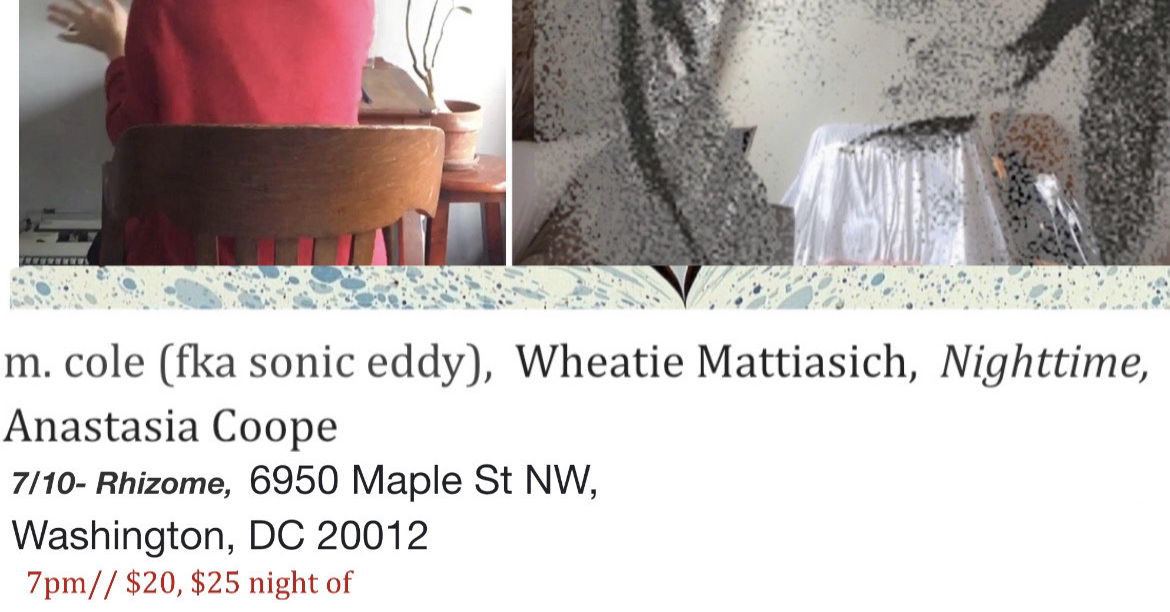 m. cole (fka sonic eddy) is an artist and musician obsessed with material medium & dialectical procession. Ritualistic aural conversation; weaving animated loops; midi-fueled dialogue; manipulated acoustics; we access the material ribbons of sound together; bodies dampen & reverberate & influence in companionship.