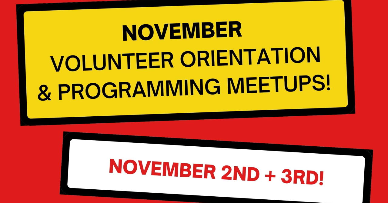 It's that time again—our monthly volunteer orientation and programming meetup! Our monthly volunteer orientation & programming meetup both take place on the first Wednesday of every month.