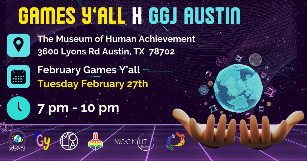 Games Y’all is a monthly meetup presented by the Museum of Human Achievement for indie devs, digital artists, and games fans. We showcase indie games and digital art projects from our local community and beyond. You can come to our meetups to play games, experience digital art, and connect with the local Austin games community.