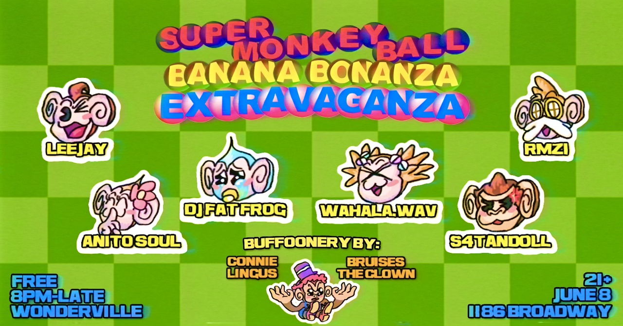 Let's get the ball rolling! DJ Fat Frog (@dj.fat.frog) invites you to a banana-tastic evening of music and visuals inspired by the Super Monkey Ball series, complete with a working setup of the OG games!