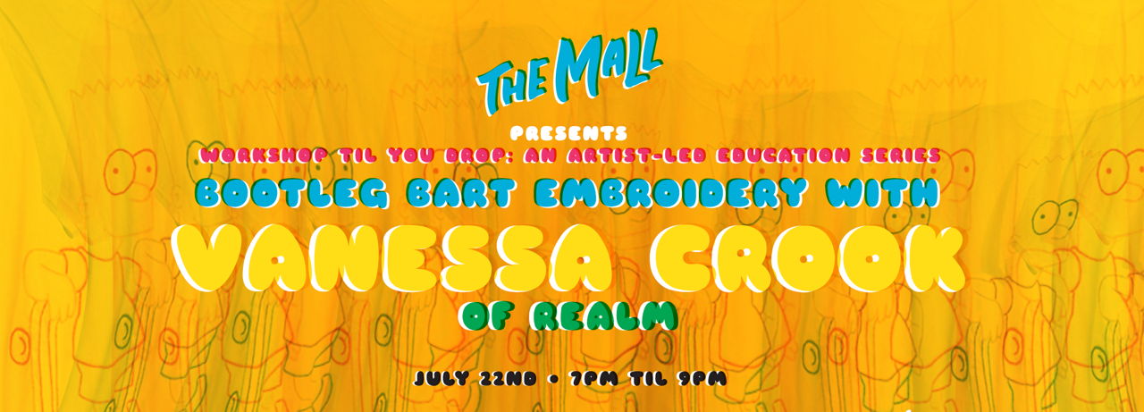 Second in The Mall's new ongoing series, Workshop Til You Drop, Vanessa's workshop is a fun, chill ? exploration of bootleg cartoon imagery, particularly Bart Simpson, and you'll leave with a bootleg tee to call your very own! With Vanessa's seasoned bootleg guidance ?, participants will learn how to create embroidered cartoon character tees, from stencil transfer to stitchin' it up.