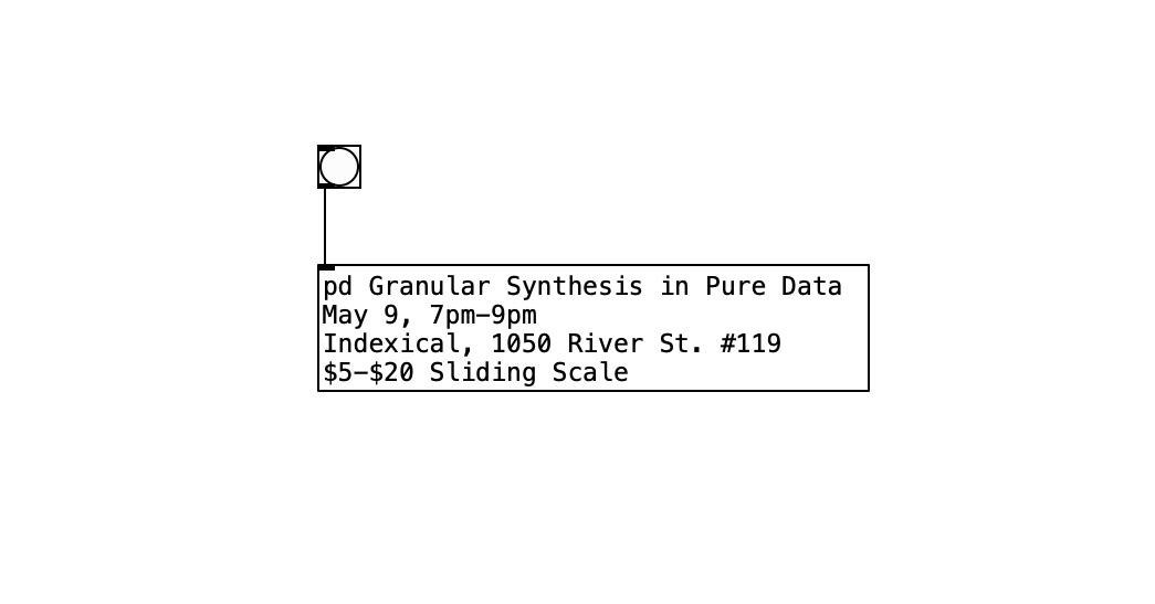 Granular synthesis is a type of sound generation that operates on the microsound timescale. In principle, a sound is broken into tiny grains; each grain serving as a building block for macroscale composition. Participants will learn basic granular synthesis techniques along with an overview of its history as we build our own custom designed granular synth in the open source software Pure Data. Pure Data (or just "Pd") is an open source visual programming language for sound and multimedia.