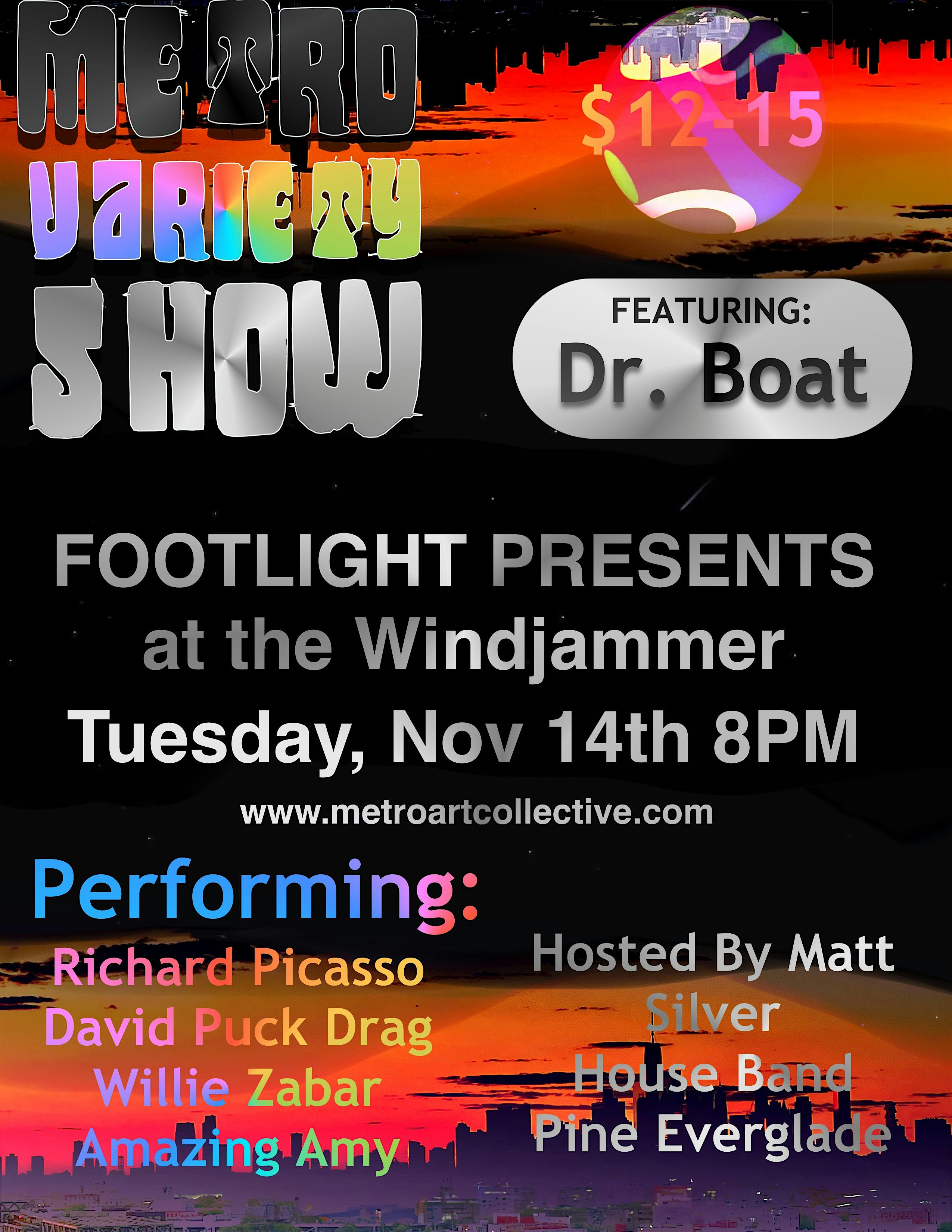 A variety show: clown, puppets, characters, comedy, performance art and Music! Raw, unique talent!. Energized by the musical prowess of Dr. Boat, ensuring an evening of non-stop dancing and joy. Your HOST Matthew Silver
