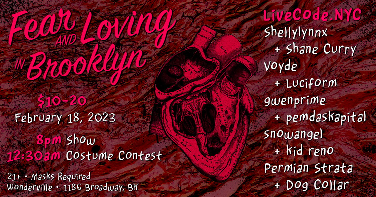 Get ready for livecode.nyc's celebration of love and fear and code... We'll dance the night away to haunting and hard hitting melodies reminiscent of your third crush and the undeniable romance of horror movie dates.