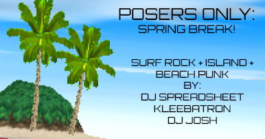 Grab your hawaiian shirts and get ready for a beach edition of Posers Only! featuring beach punk, island jams, and surf rock. DJs Josh, Kleebatron, and DJ Spreadsheet are bringing the tunes and we'll be serving up Mai Tais to help you forget about the actual temperature outside.