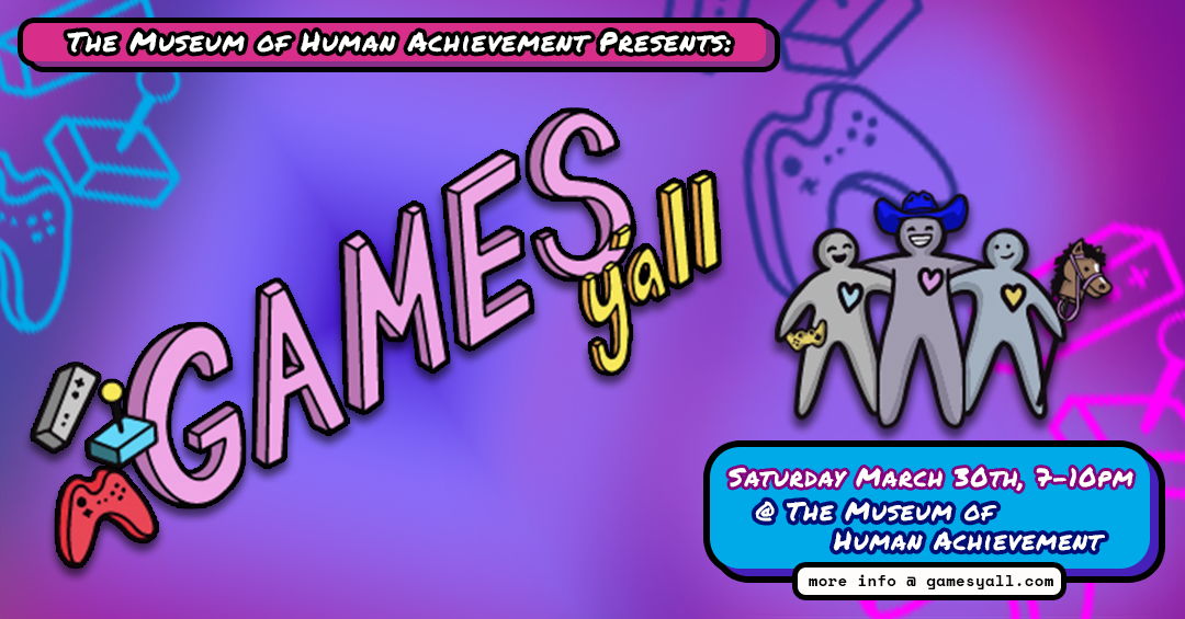 Join us on the last Saturday of March for Games Y’all! We’ll be back at The Museum of Human Achievement with a fresh selection of locally produced Indie Games. Interested in submitting a game? We are currently accepting submissions for our April and May Games Y’all Meetups.