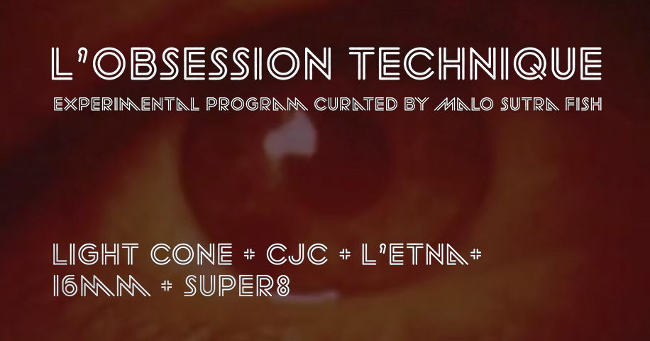 L’Obsession Technique is a selection of works curated by MaLo Sutra Fish taken mostly from Light Cone and Collectif Jeune Cinéma catalogues, two major landmarks of the Parisian Experimental Scene. It is the extended version of a program shown at Emerson College, Boston, centered either around personal technical obsessions or presenting major film collectives, core subjects of MaLo Sutra Fish’s practice. Showcasing filmmakers from L’Etna and L’Abominable, with a special tribute to the Australian NanoLab, the common thread is the technical play as an illustration of memory.
