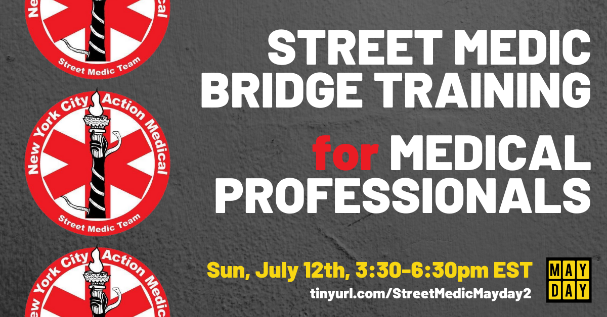 New York City Action Medical (NYCAM) and Mayday Space are hosting a free online bridge training on Sunday, July 12 3:30 PM – 6:30 PM EST (12:30-3:30 PM PST) for MEDICAL PROFESSIONALS who want to learn how to apply their skills to support protestors. Please note that this training is for people with WFA, EMT, paramedic training as well as doctors, nurses, etc. Because of the prior knowledge needed, only having first aid and CPR/AED certification is not sufficient to attend this training.