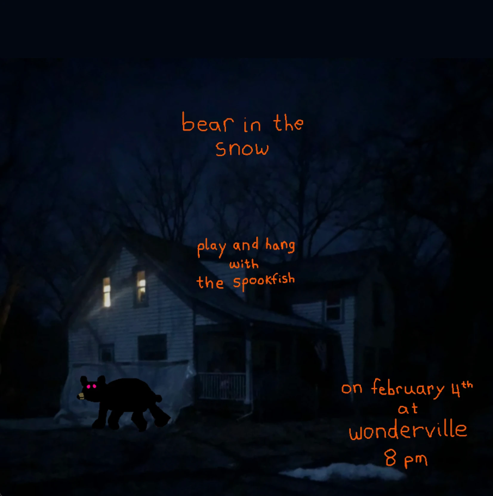 Play the sprawling, janky, heartfelt, haunted, surreal, and secret-filled “bear in the snow” in the Wonderville cabana and discuss with the game’s creator, experimental musician, the spookfish.