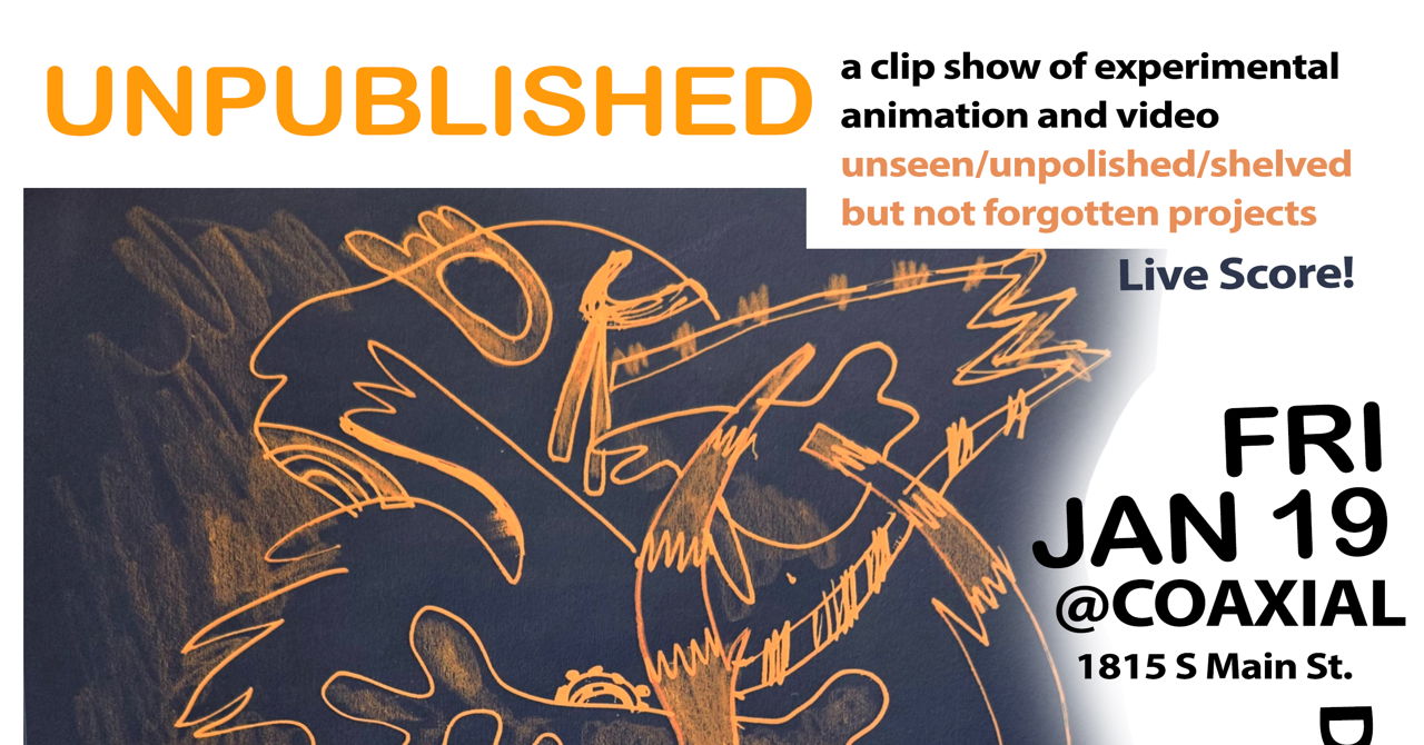 Circling Back will conclude with a screening on January 19th, titled "Unpublished" - a clip show of over 20 experimental animators and filmmakers unfinished projects, test shots, and weird side projects, curated by Josh Cloud and Kate Renshaw Lewis. Unpublished is an experimental smorgasbord of works in progress, whether that be a forgotten/unfinished film, a glamorous pipeline test, a material experiment that deserves some goddamn recognition, or that weird project that someone don't know where to put because it doesn’t match their usual style. Get us a peep behind the curtain, a look into the madness, and see something previously unseen with an intimate room full of people at Coaxial. The screening will be accompanied by a live score by Jude Tedaldi and Marko Kurtovic. Friday, January 19. Doors at 7pm Screening starts at 8pm