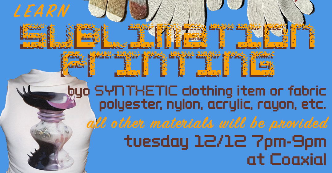 this month sewing circle is back on tuesday december 12, 7pm-9pm at Coaxial. we have a special guest olivia h @viva.xoxo, creator of @opheliabyrne.xo, coming by to teach us sublimation printing ! printing materials will be provided. we will NOT be providing clothing or fabric to print on. bring your own pieces that you want to rework! the fabric must be synthetic (polyester, nylon, rayon, acrylic, etc) in order for the print to work. we'll see you in the circle!