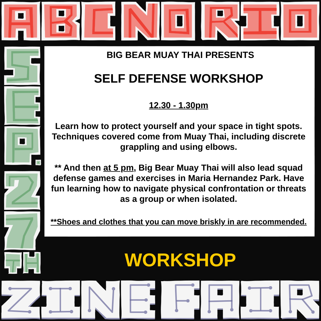 * And then at 5 pm, Big Bear Muay Thai will also lead squad defense games and exercises in Maria Hernandez. Have fun learning how to navigate physical confrontation or threats as a group or when isolated.
