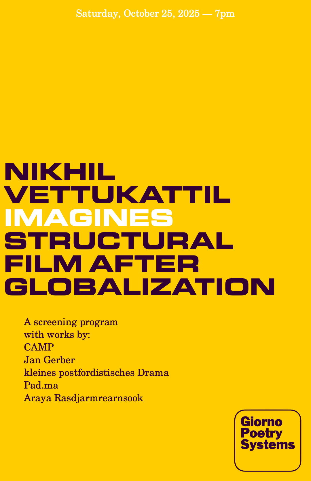 Focusing on perspectives from largely outside of the Anglo-American imperialist axis that came to define structural film in its nascent form, Nikhil presents a suite of moving image works in video, HTML5, and live processing by CAMP, Jan Gerber, kleines postfordistisches Drama, Pad.ma, Araya Rasdjarmrearnsook, and himself that can be seen to enact the legacy of structural film’s techniques, while positioning lived experience and social intervention as primary.