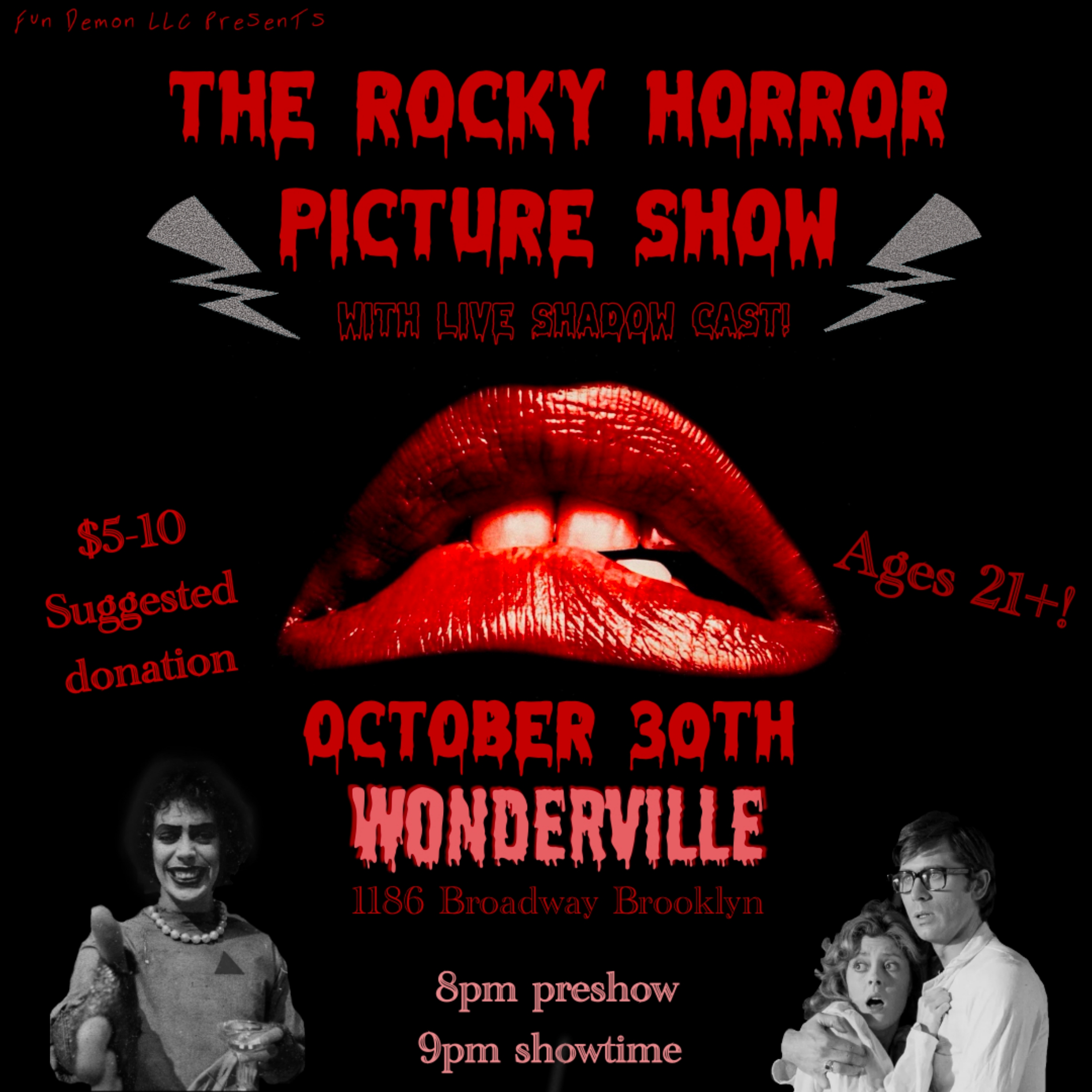 50 years after the original premier of The Rocky Horror Picture Show, we’re showing it with all the camp and debauchery it deserves! With the time-honored traditions of a shadow cast and preshow, this event will titillate virgin audience members and super sluts alike. Featuring homemade props and costumes (very camp), audience partici……pation guides, and more! Bring a friend, bring an enemy, bring your whole polycule! $5-10 Suggested donation :)