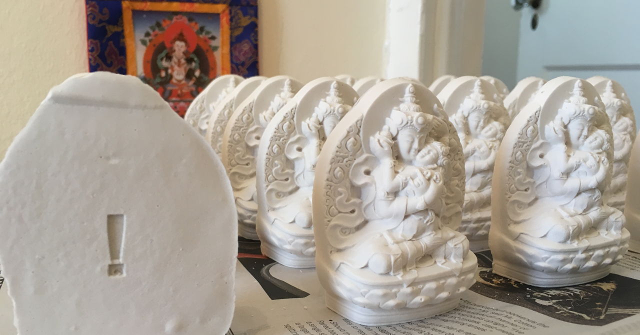 The creation of Tsa Tsas is a unique yoga that, nowadays, consists of pouring hydrolcal (pearly white gypsum cement) into moulds while muttering mantra and augmenting one's perception with their imagination.
