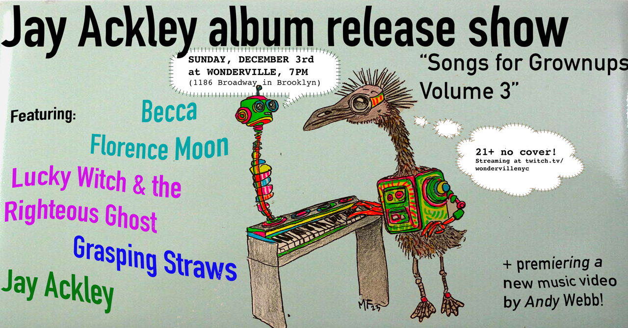 Come celebrate the release of 'Songs for Grownups Volume 3', Jay Ackley's new solo album. Jay will be playing a set of new songs and old favorites, and premier a new music video by Andy Webb for the song 'Jay Ackley Mach 9'.