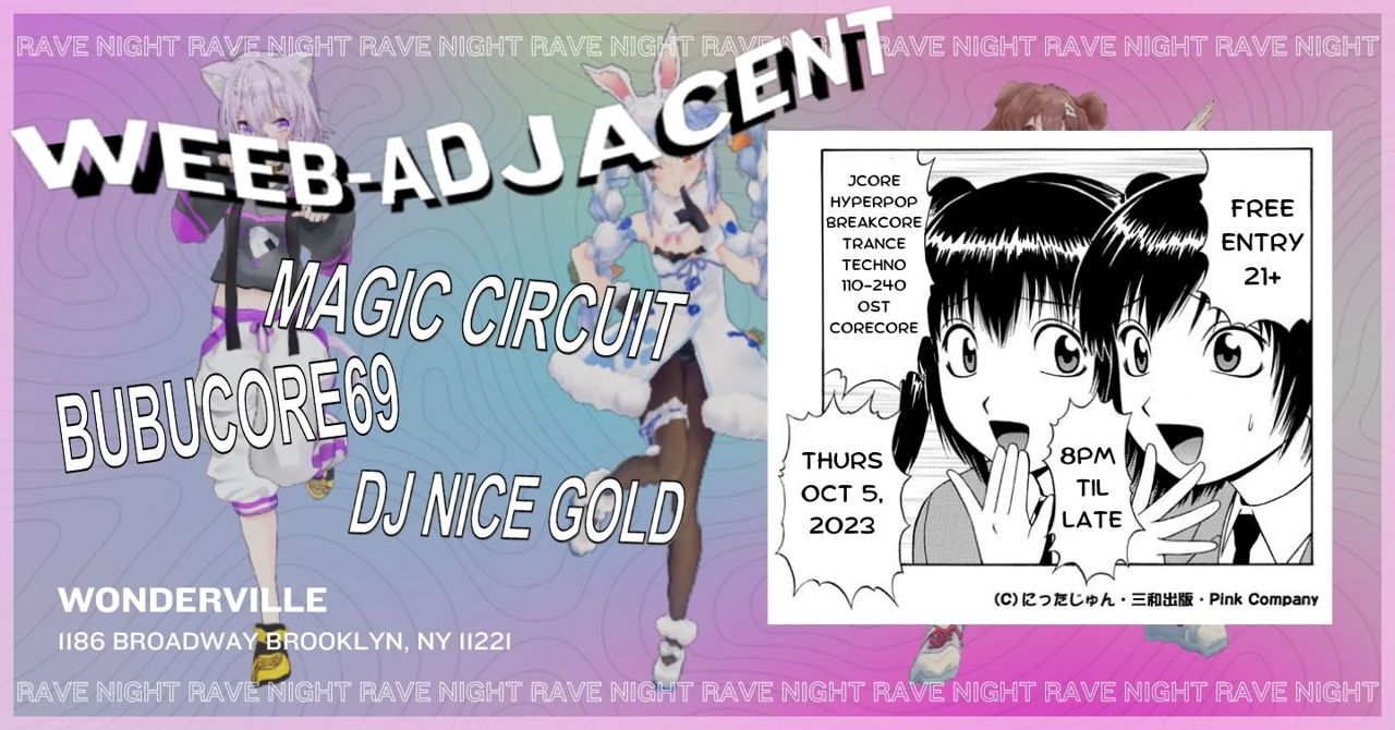 WEEB-ADJACENT is the post-con anime rave for the chronically online. Come thru for J-core/happy hardcore, hyperpop, drum n bass, anisong remixes, breakcore, trance, and Caramelldansen played really really really fast. Magic Circuit, BUBUCORE69, and DJ Nice Gold will be spinning rave choons all night, with free entry at the door!