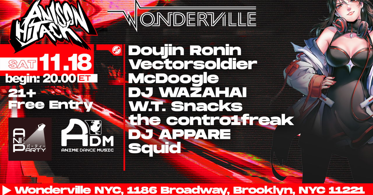 Anison Hijack is teaming up with Aniparty and Anime Dance Music to bring you the best party of AnimeNYC weekend! Come visit us at Wonderville in Bushwick to dance the night away in style. 21+ only, free entry.