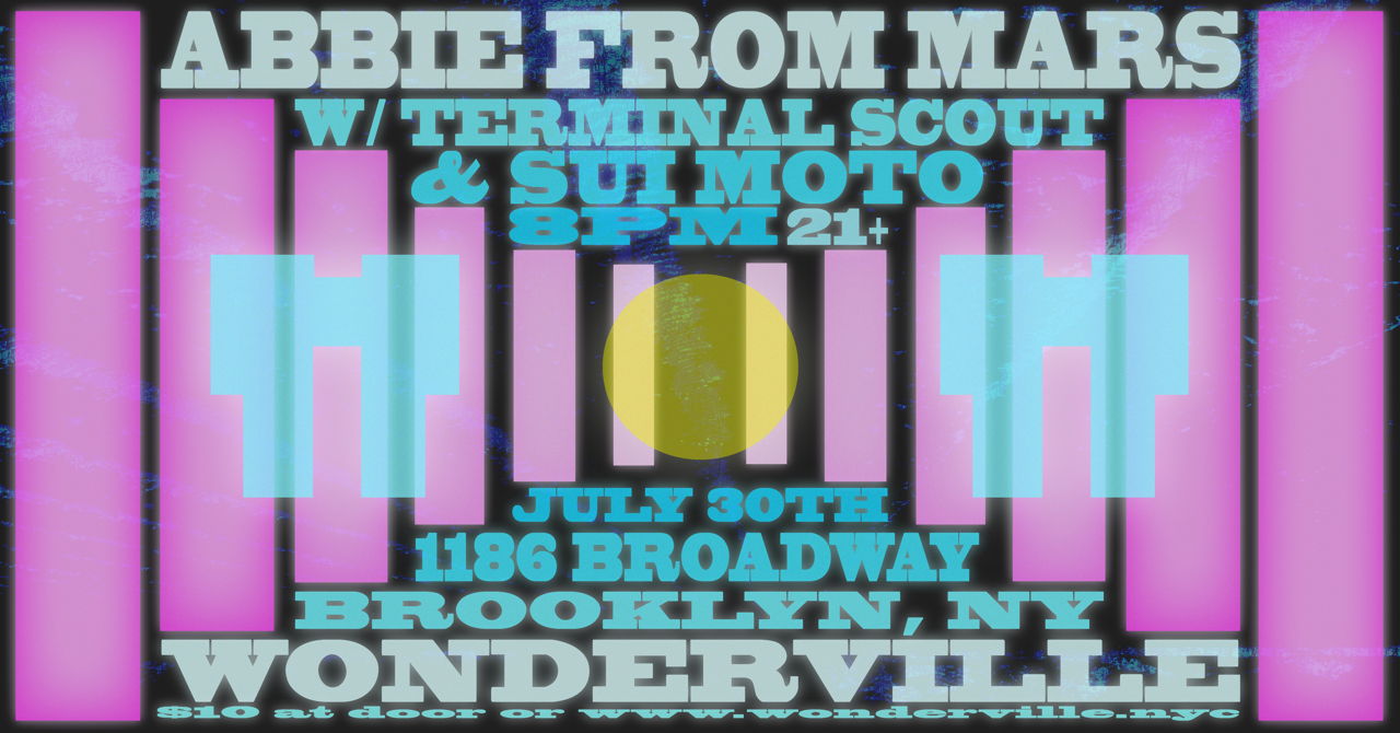 Send July out with a cacophonous bang! Sui Moto and \[https://www.suimoto.com/\] their disarming synth melodies will share the stage with Abbie from Mars \[https://abbiefrommars.com/music/\], fresh off tour and bringing her experimental pop back to Brooklyn, and chaos dynamo Terminal Scout, \[https://soundcloud.com/toweroflight/election-year\] showcasing his percussive glitches and twitches. Doors are at 7:30pm. $10 in advance or at the door. 21+