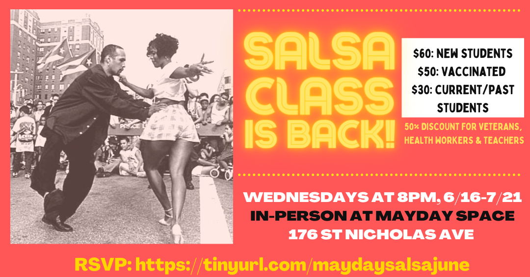-- Returning Students (if you have taken Salsa at Mayday before): $30 (email us to receive the link to the discounted ticket)