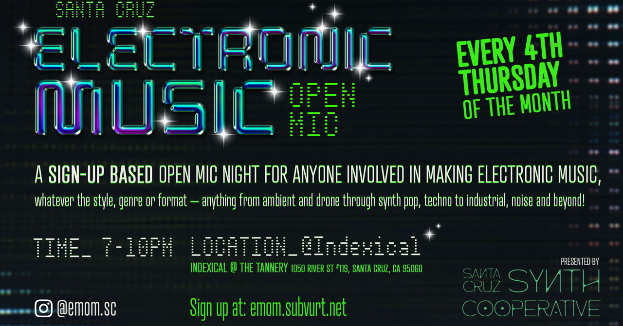 A sign-up based Open Mic night for anyone involved in making electronic music, whatever the style, genre or format - anything from ambient and drone through synth pop, techno to industrial, noise and beyond!