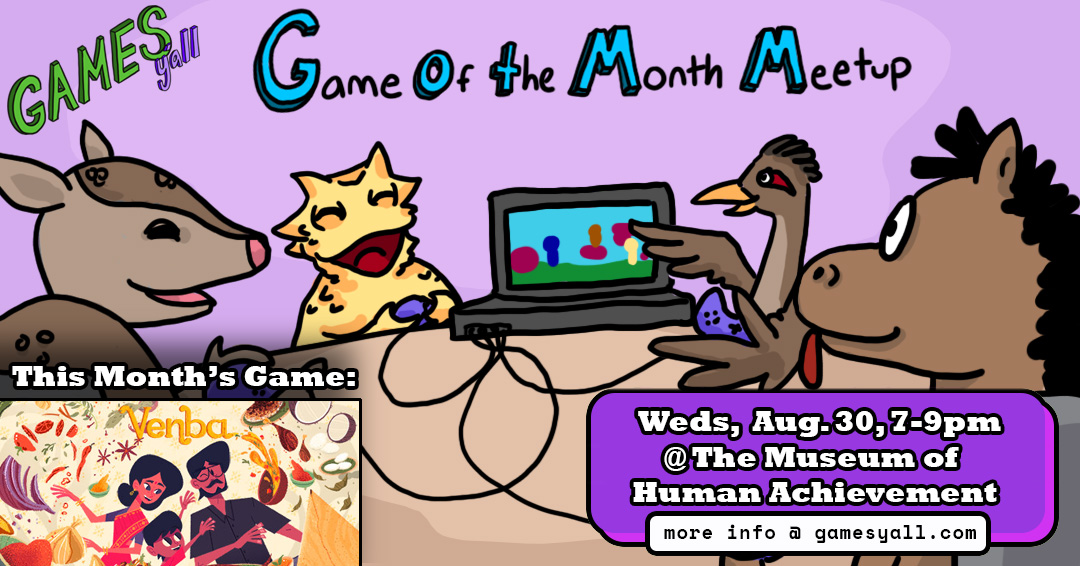 GOTM Meetup! It’s like a book club, but for games! Meet once a month with fellow members of the Games Y'all community to discuss the Game of the Month. Share your thoughts about the game design, narrative, art, and your experience playing the game! Meetings will be held 7-9pm on the last Wednesday of every month at the Museum of Human Achievement in the IRL Computer Lab. Snacks and drinks are permitted, but not provided.