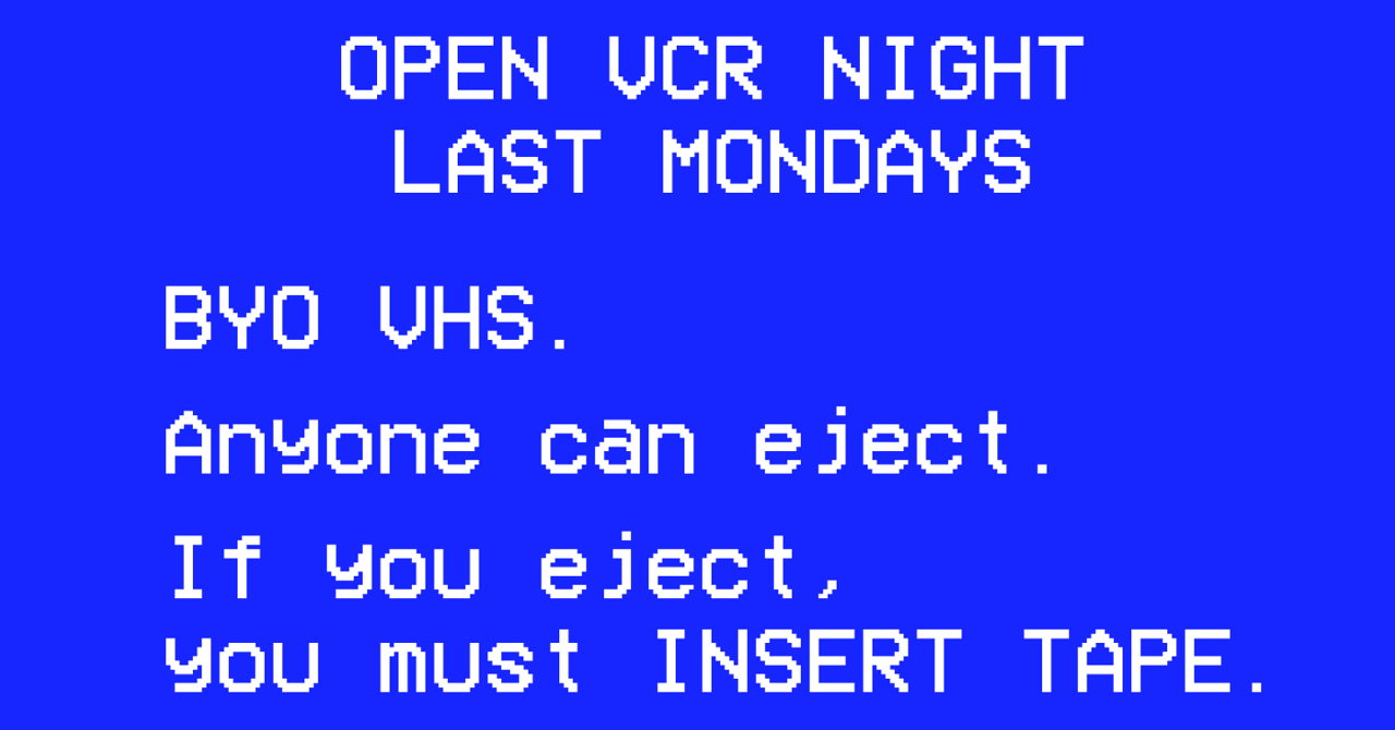 90s Disney, workout videos, softcore, student films, local interest, choir recitals, insensitive cringe: anything may play. Anything may be ejected.