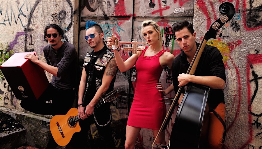 A jazz kit played with sticks and mano, an upright bass tattooed with comely women, jaunty Caribbean-influenced acoustic guitar and a beautiful blonde siren with, yes, a trumpet.