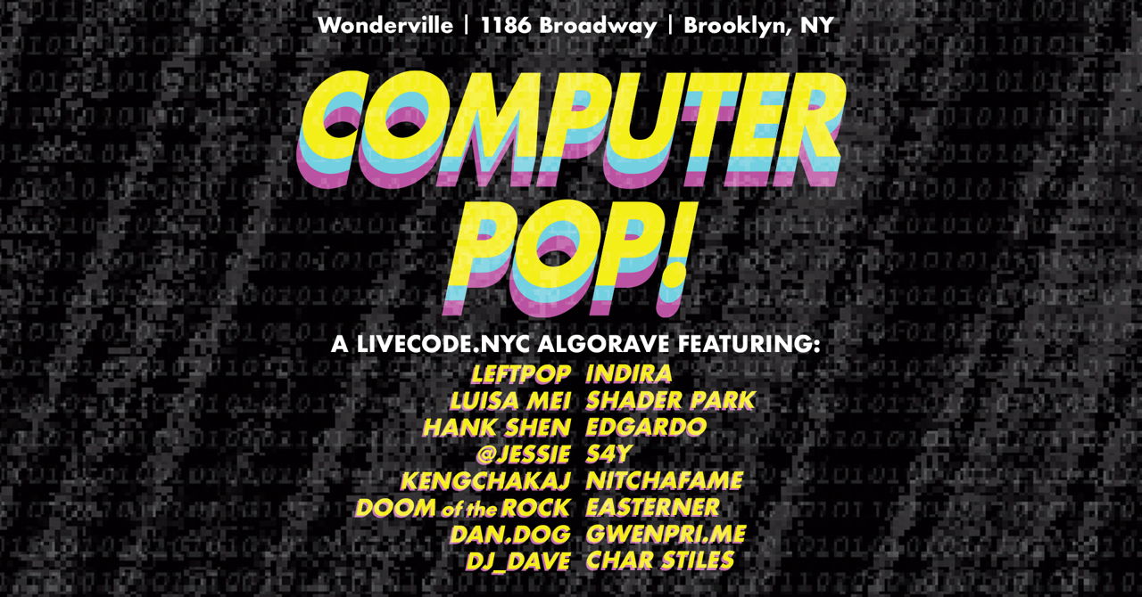 Join us for a COMPUTER POP! Algorave, put on by LiveCode.NYC on Friday October 8th. Doors at 7:30 and going until LATE! The Algorave will feature audio visual performances all created with code or coded-technologies by local and guest artists. Proof of vax and masks will be required as this is an indoor event.