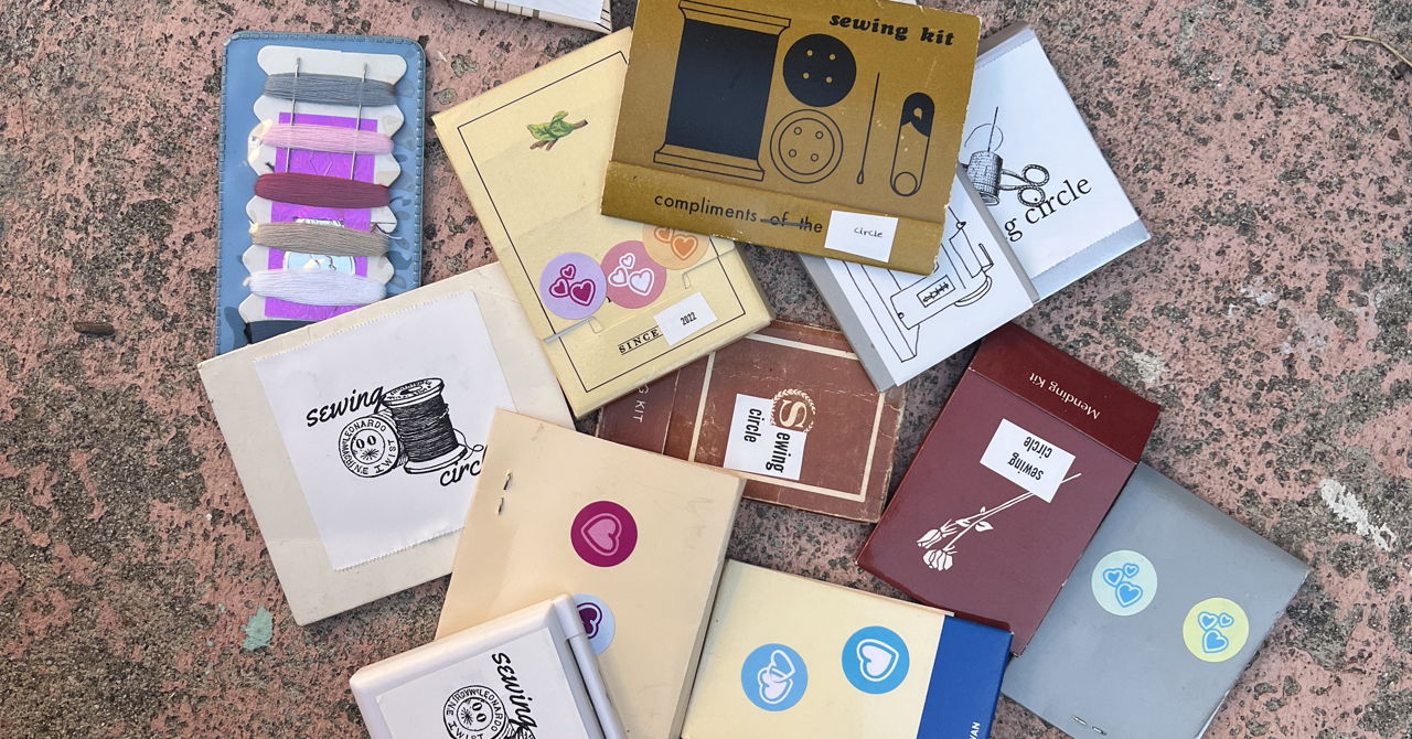 additionally ʷʰᶦˡᵉ ˢᵘᵖᵖˡᶦᵉˢ ˡᵃˢᵗ we will be handing out sewing circle branded sewing kits, which are just old abandoned sewing kits with sewing circle stickers on them :) meant to keep the circle close to your heart in those weeks between meetings ❥