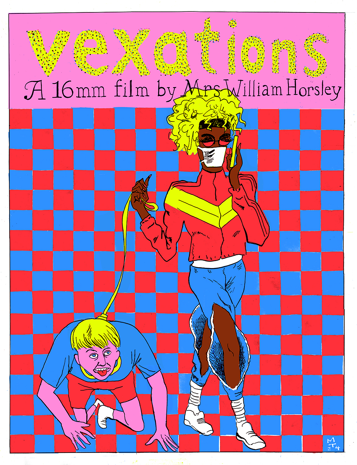 Matthew Thurber is a cartoonist and filmmaker based in NYC. He is the author of 1-800-MICE, INFOMANIACS, Art Comic, Looking For The Cat. He has performed at the Serpentine Gallery UK, Hammer Museum LA, and had a 2 person drawing show with William Wegman in 2017. Thurber’s films Fleegix (2019), The Sea Masons (2021), and Vexations (2024) are feature length narratives on 16mm, manifesting as performances. Mrs William Horsley is a cinema “band” in which the films, made in a role playing game process, are projected in ritual performance.