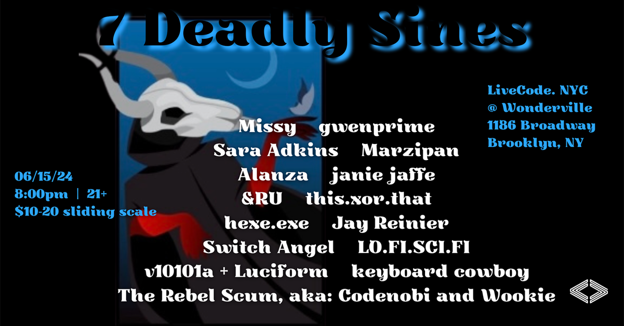 This Pride month, livecode.NYC would like to spotlight the other deadly sins with a night of queer livecode music and visuals. Join us for an evening filled with the 7 deadly sines, from wrathful amplitudes to slothful wavelengths and maybe a tangent or two.