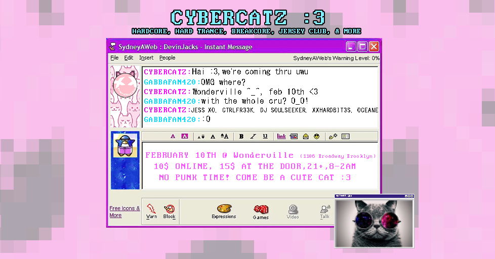 The CYBERCATZ are coming! :3 Come party with DJs JESS XO, CTRLFR33K (FKA Finneon), DJ SOULSEEKER, OCEANE, and XXHARDBIT3S for some hardcore, hard trance, breakcore, jersey club, and more sounds for the robo-kittiez! We keeping it cute and we're going hard! Free uwus at the door.