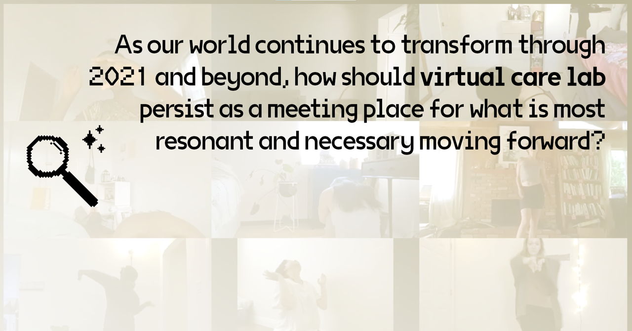 virtual care lab began as a project responding to our need for remote togetherness and community early in 2020, amidst the pandemic. Since then, through our dozens of unconventional gatherings, portals for asynchronous presence, weekly Lab Hours, movie nights, research groups, book clubs, and countless Discord exchanges, we have surfaced many deeper inquiries about care in digital commoning and creative experimentation. As our world continues to transform through 2021 and beyond, how should virtual care lab persist as a meeting place for what is most resonant and necessary moving forward?
