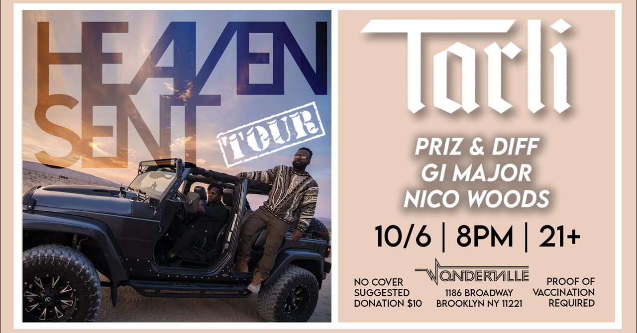 Tarli is excited to bring the Heaven Sent Tour to Wonderville NYC October 6, 2022 to debut his latest single “Heaven Sent” ft. Wes. The Heaven Sent Tour will also feature Minneapolis based Hip-Hop duo, Priz & DIFF along with talented local opening acts on each stop.