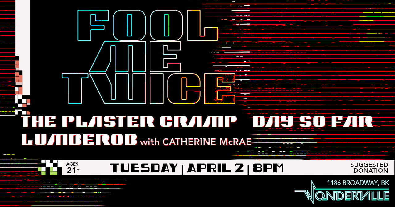 FOOL ME TWICE beckons you beyond cognitive dissonance to avoid the shame of doubling-down on poor choices and to gather together for a night of eclectic electric impulse indulgence with the glitch-tech of Lumberob with Catherine McRae, the darkwave of Day So Far, and the psychedelic post-punk of The Plaster Cramp.