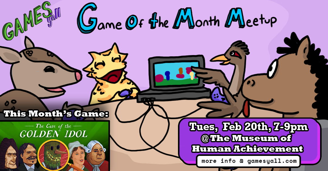 GOTM Meetup! It’s like a book club, but for games! Meet once a month with fellow members of the Games Y'all community to discuss the Game of the Month. Share your thoughts about the game design, narrative, art, and your experience playing the game! Meetings will be held at the Museum of Human Achievement in the IRL Computer Lab. Snacks and drinks are permitted, but not provided.