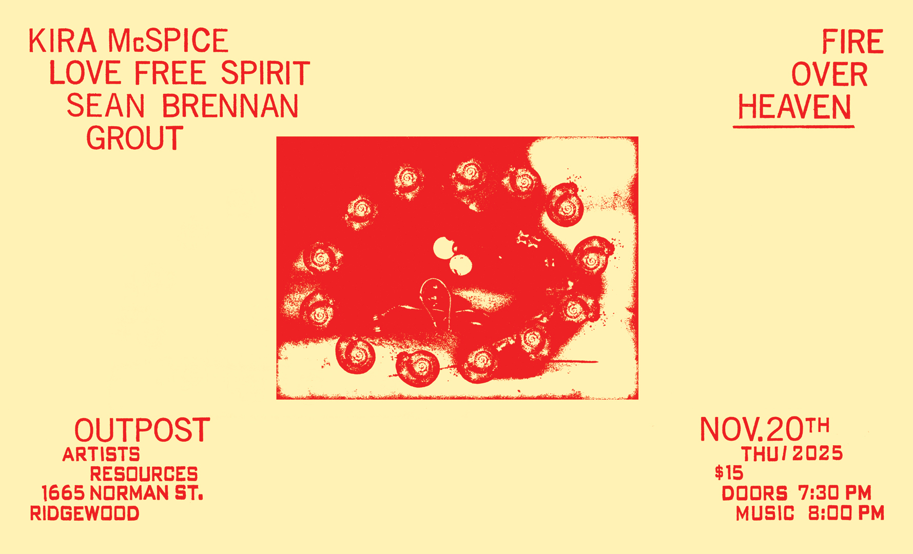 Our first show of the season is on November 20th, featuring Love Free Spirit, Grout, Kira McSpice and Sean Brennan, curated by Mika Lungulov-Klotz. These four artists all work in beautifully layered ways, weaving imaginative, intimate, haunting, playful, contemplative and harsh textures together.