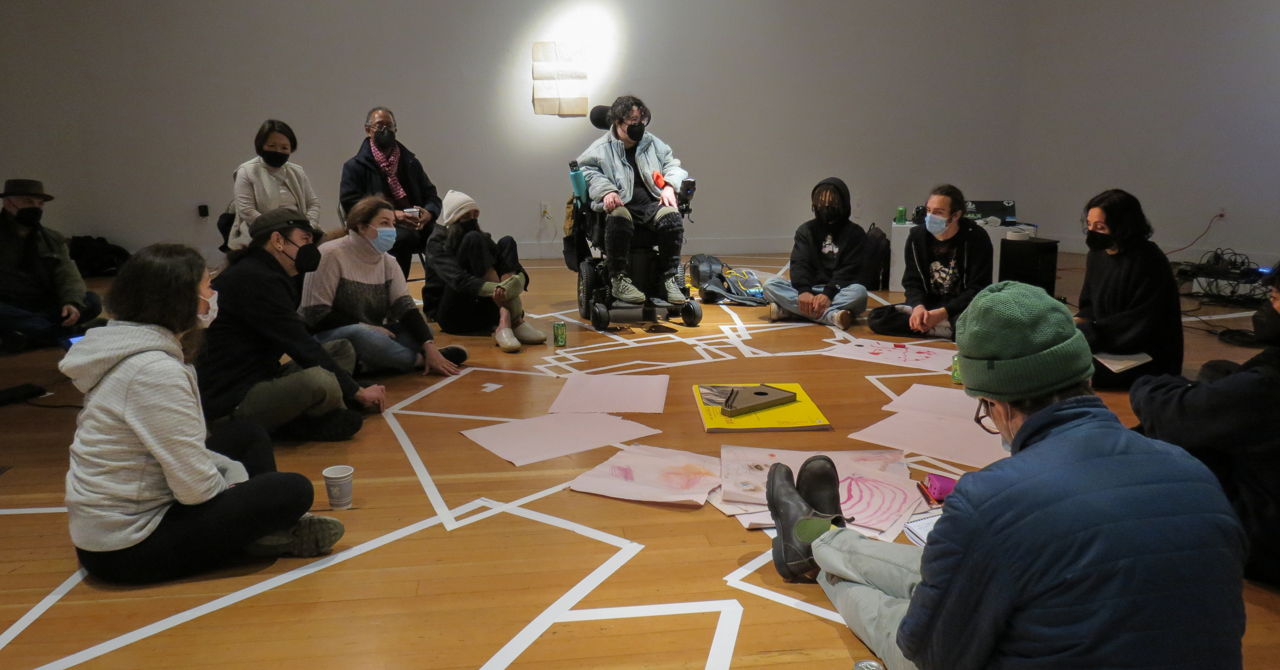 S3ljam is a 2-night performance and convening that formally presents a compilation of 6 scores collectively developed in workshops between December 4, 2022, to January 15, 2023, as part of Sunday Sessions X MAJLES, during Sholeh Asgary's residency at Berkeley Art Center. Sunday Sessions built upon, and at times, broke down, MAJLES, a program that situates the body as a site of knowledge, enacting movement and voice from and within the physical place they occupy to explore complex relationships to space, place, and one another. "Majles" is an Arabic and Persian term that translates to council. In this context, it refers to a creative contract as a form of decentralized governance. The weekly 3-hour Sunday Sessions sought to build collaborative and cross-cultural processes of score writing within a non-hierarchical framework. Each composition connects specific types of movement work (including strikes, protests, home, collectivity, and rest) to the collective build and physical space within which the score is developed and eventually performed through sound, movement, silence, text, and image.